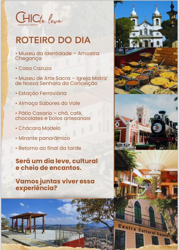 No dia 07/12, acontece um passeio cheio de inspiração, leveza e aquele senso de pausa que faz bem. O roteiro inclui a visitação a sete pontos turísticos de Vassouras, além do almoço com comidas típicas e outras refeições, que serão pagas à parte.