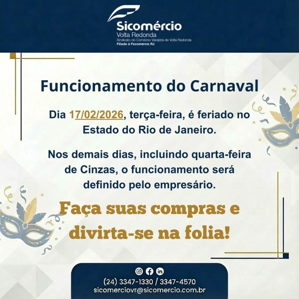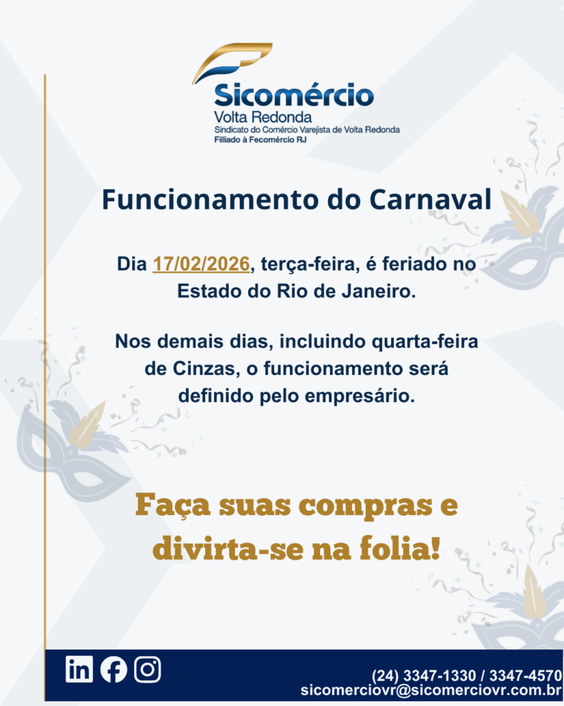 No dia 17/02, terça-feira de Carnaval, é feriado estadual, mas as empresas que quiserem abrir precisam retirar o Temo de Abertura no Sicomércio-VR, respeitando as cláusulas da Convenção Coletiva. Nos demais dias, incluindo a Quarta-feira de Cinzas, o funcionamento das lojas ficará a critério de cada empresário.