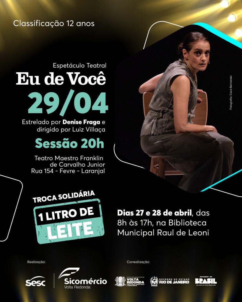 O espetáculo será na quarta-feira, 29/04, às 20h. A entrada é uma caixinha de leite e a troca pelos ingressos para o monólogo ‘Eu de você’ acontece hoje, (27) e amanhã, (28); na Biblioteca Municipal.