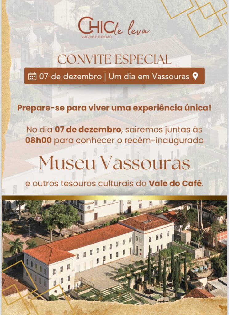 No dia 07/12, acontece um passeio cheio de inspiração, leveza e aquele senso de pausa que faz bem. O roteiro inclui a visitação a sete pontos turísticos de Vassouras, além do almoço com comidas típicas e outras refeições, que serão pagas à parte.