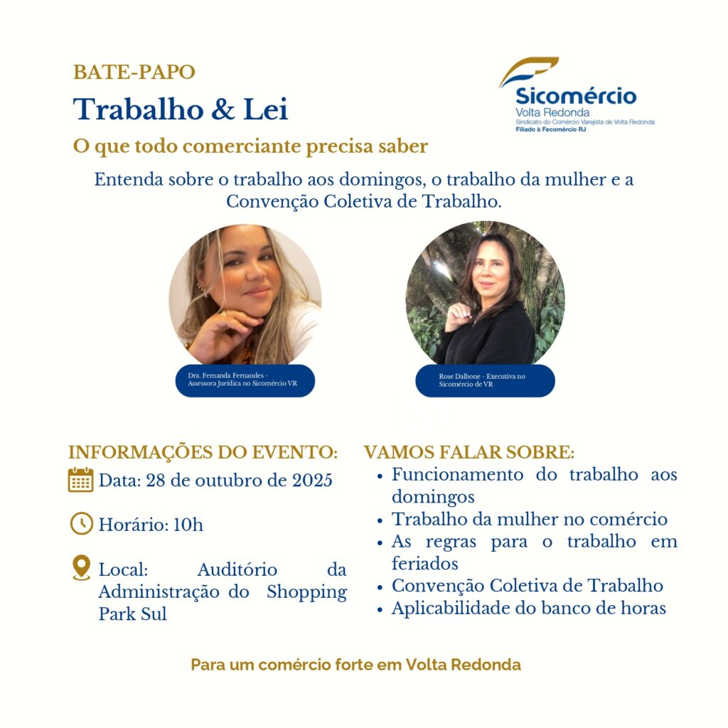 No dia 28/10, a gerente-executiva do Sicomércio-VR, Rosemeri Carvalho Dalbone, e a assessora jurídica, Fernanda Fernandes, vão estar no Shopping Park Sul, a partir das 10h, para um bate-papo com lojistas sobre um tema que vem sendo cada vez mais importante nas empresas: “Trabalho & Lei”, com o objetivo de orientar sobre a Convenção Coletiva […]