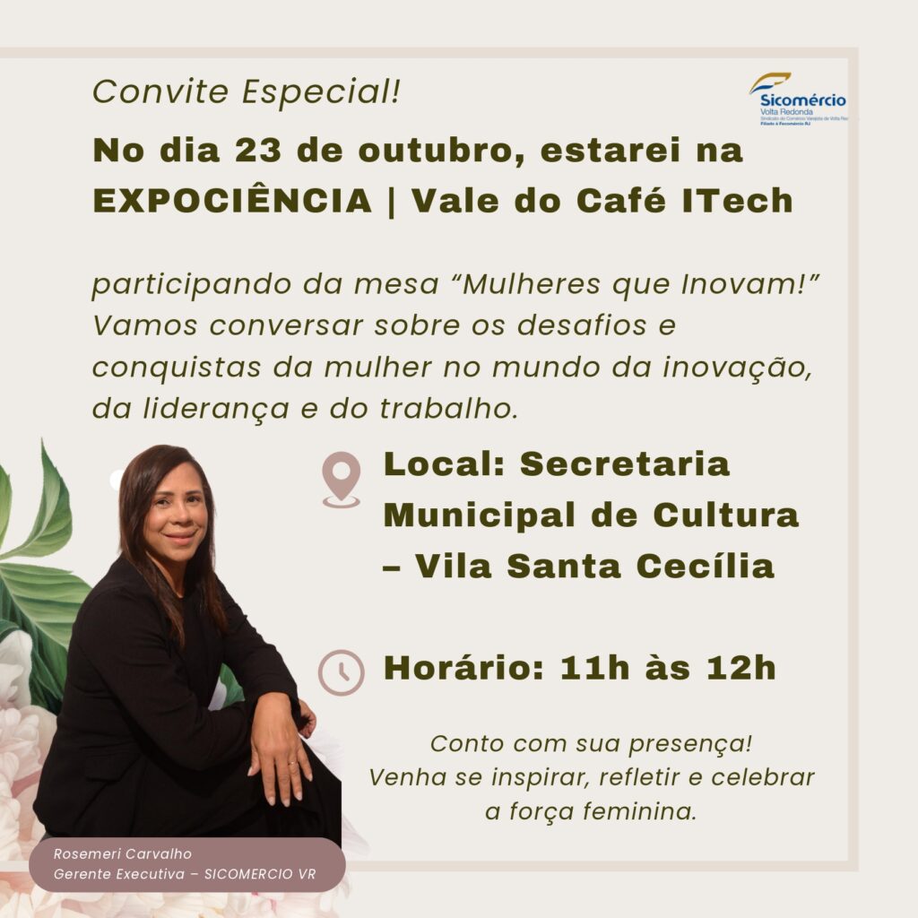 Rosemeri Carvalho, participará nesta quarta-feira, 23 de outubro, da mesa de debates “Mulheres que Inovam!”, durante a programação da Expociência / Vale do Café ITech – Conexão & Sustentabilidade, que acontece no auditório da Secretaria Municipal de Cultura, na Vila Santa Cecília. Essa é a quinta edição do evento. A mesa será realizada das 11h às 12h,