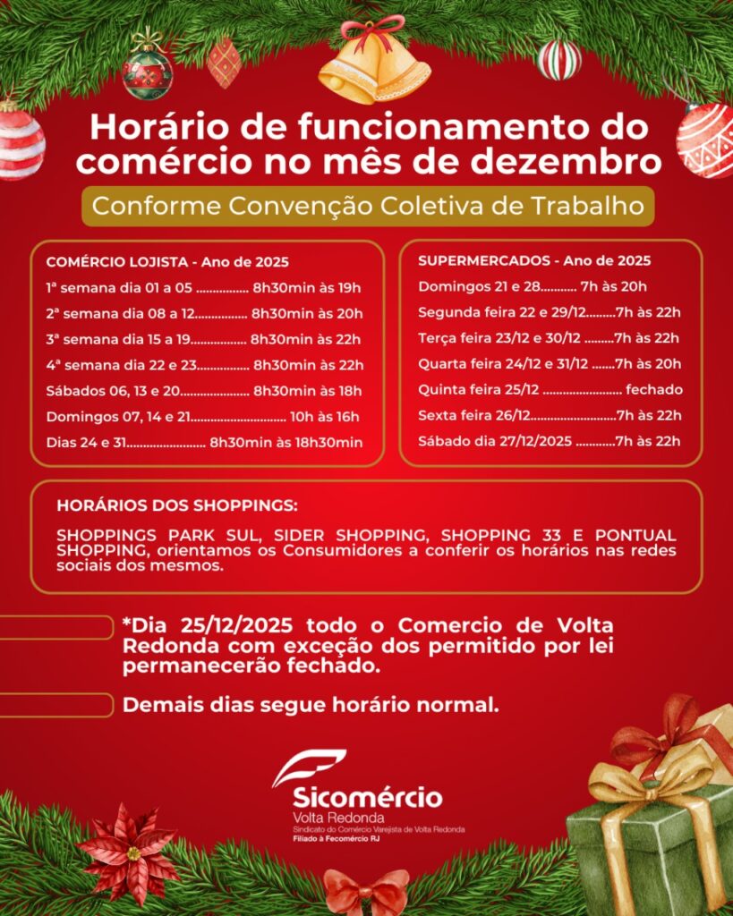 Horário de funcionamento do comércio no mês de dezembro de 2025